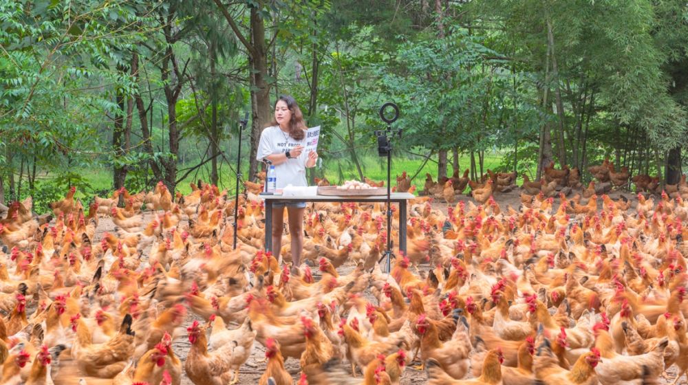 主播正在雞群中進(jìn)行河田雞產(chǎn)品直播帶貨